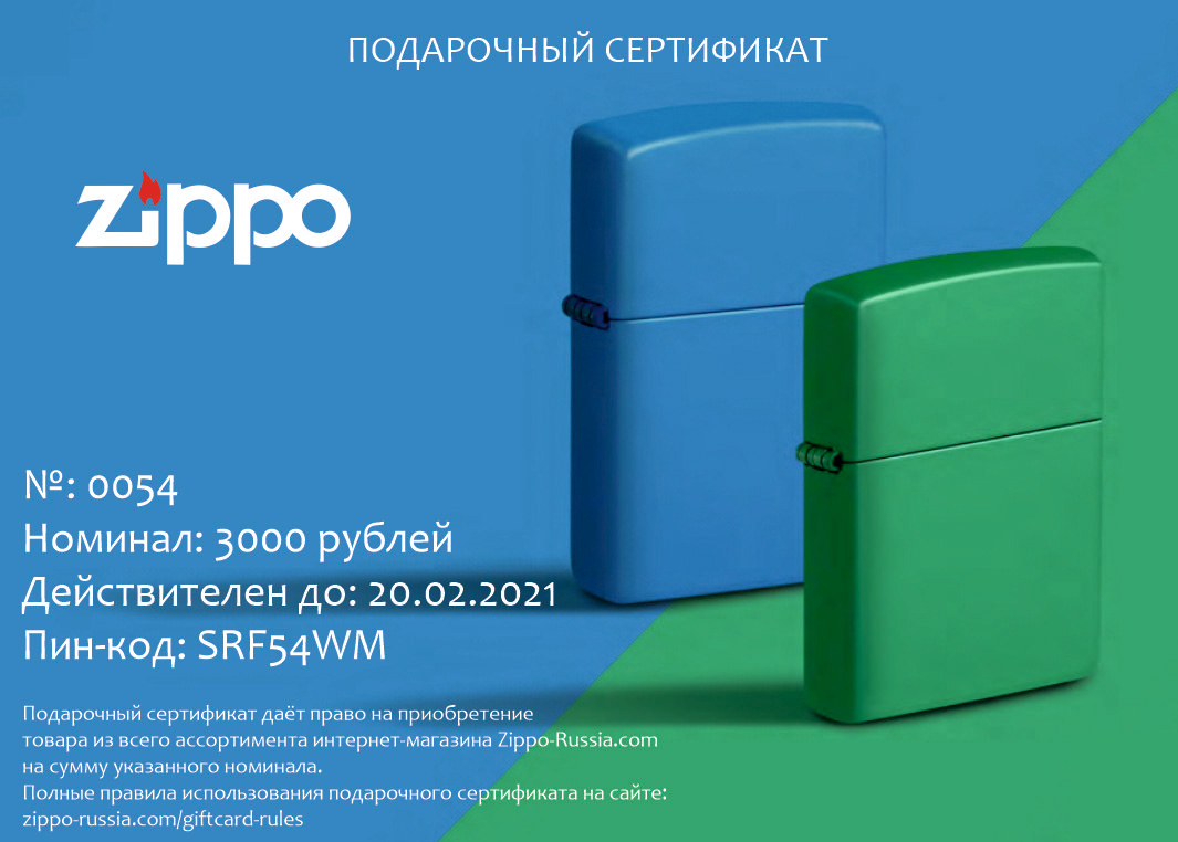 Подарочный сертификат Zippo 5000 от официального дилера Zippo в Грозном. Вы можете дополнительно заказать гравировку, которая подчеркнет Вашу оригинальность и придаст памятность статусному подарку.